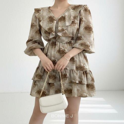 보니제이 / 브이넥 퍼프소매 긴팔 미니원피스 플라워 쉬폰 셔링
