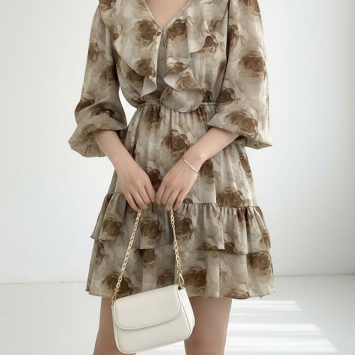 [보니제이]브이넥 퍼프소매 긴팔 미니원피스 플라워 쉬폰 셔링