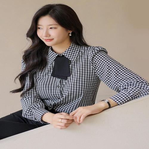 [스타일온미][루이스엔젤] 플리에 타이SET 하운드 체크 카라 블라우스