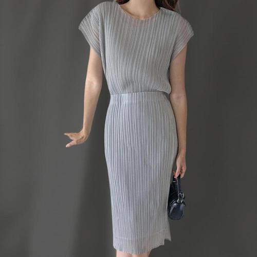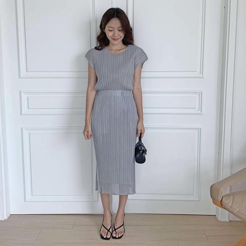 [샵앤]국산 여성 하늘하늘 얇은 플리츠 반팔 롱원피스 LL-WDR-4668-연핑크