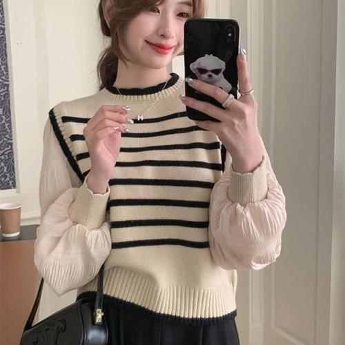 3색 반목 플리츠 얇은 긴팔 가을 니트 시스루 이너티 여자 골지 WFLPTNG