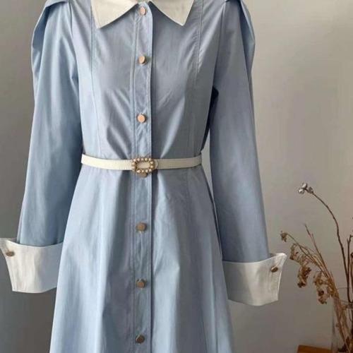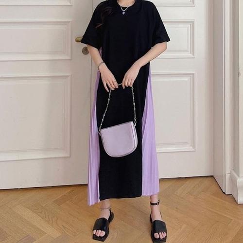 [엄지척]심플 라운드넥 코튼 배색 플리츠 주름 롱원피스_19861196_667501