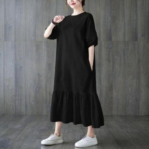 [옷자락]여성 면 레이온 핀턱 셔링 스트링 반팔 롱 원피스