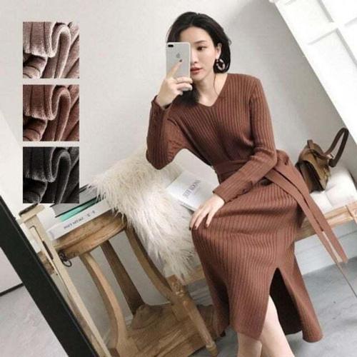 [셀럽하우스]겨울 KRHU9421 슬림핏 데일리 브이넥 골지 보온 니트 롱 원피스