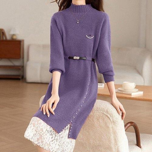 여성용 봄 가을 라운드넥 레이스 스웨터 꽈배기 니트 롱 원피스