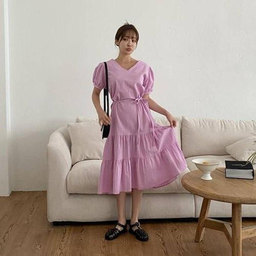 롱 여성 원피스 하객 아리밍 셔츠 쉬폰 브이넥 WFKOIXD