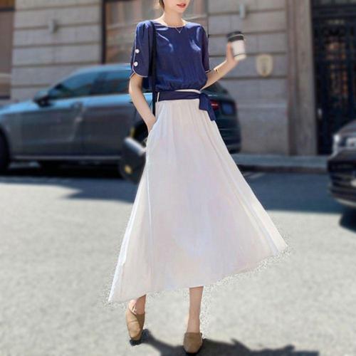 [셀럽하우스]여성 RQVJ2750 여름 네이비 화이트 롱 반팔 레이온 반팔 원피스
