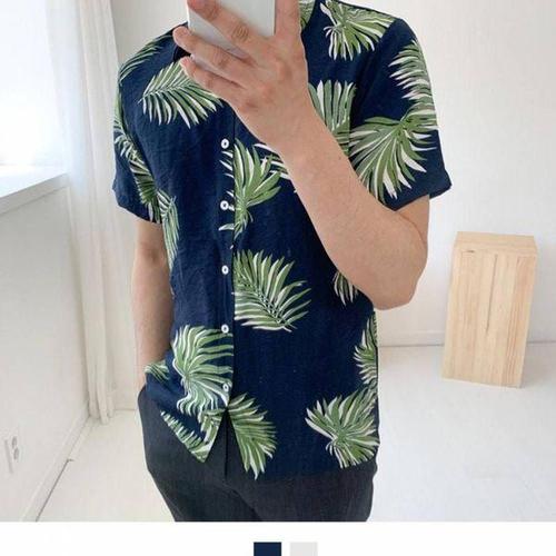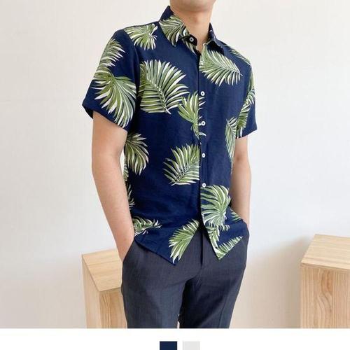 인어미남 남성 여름 하와이안 셔츠 얇은 쿨 오버핏 프린트 반팔 상의