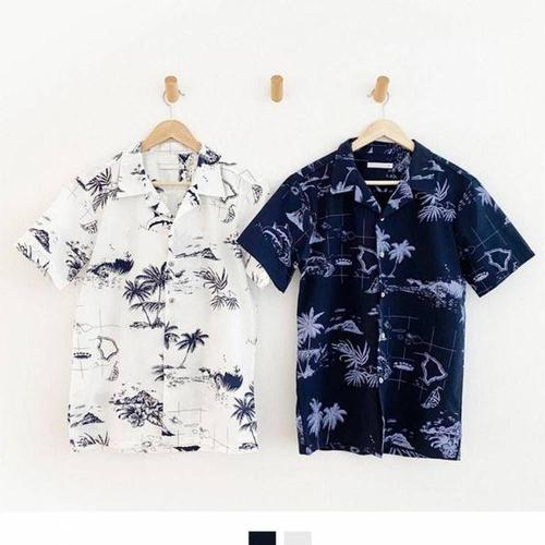 [에이치플러스몰]커플시밀러룩 야자수 오픈카라 하와이안셔츠 빅사이즈