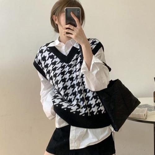 [옷자락] 여성 클래식 하운드투스 브이넥 니트 조끼