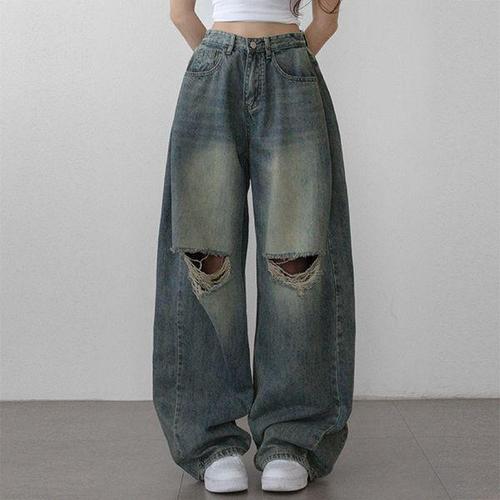 1+1 하이웨스트 빈티지 블루커브 데님 팬츠 여성 스트레이트 와이드진