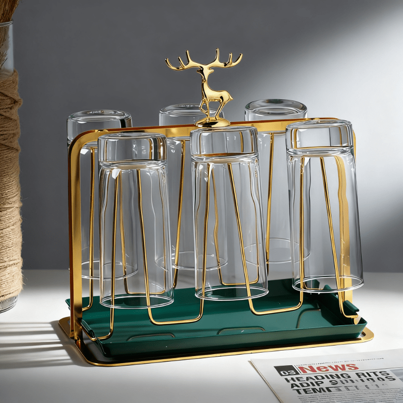TEMU 골든 사슴 벽걸이 유리 홀더 - 튼튼한 트레이 포함, 헤비듀티 철/플라스틱 컵 랙, 그린 리프 디자인, 와인 & 텀블러용 - 공간 절약형/다이닝 데코, 크리스마스, 집들이 선물 추천 (골든톤 사슴)|텀블러