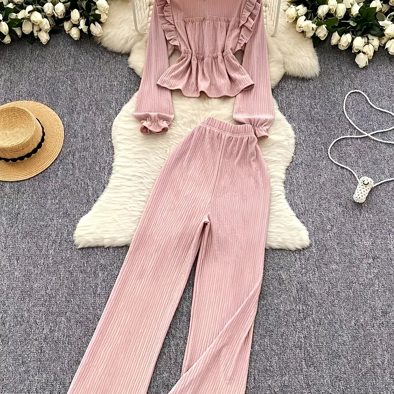 TEMU 여성용 우아한 긴팔 블라우스 & 와이드 레그 팬츠 세트 - 퍼프 소매 러플 헴 탑, 루즈핏 트라우저, 캐주얼 또는 포멀에 적합한 올 시즌 시크한 의상