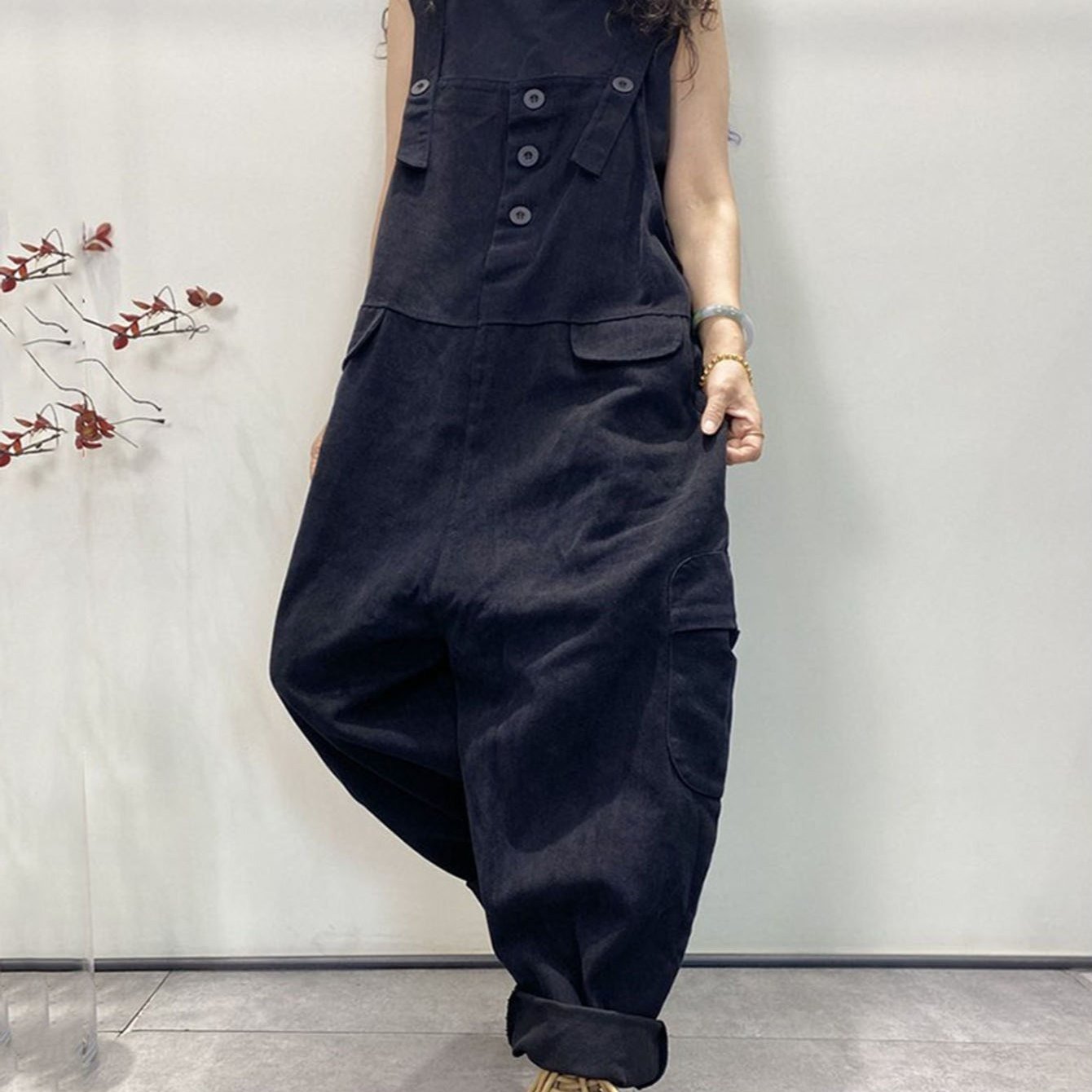 여성 대형 코튼 린넨 스트랩 루즈 점프 슈트 여름 캐주얼 와이드 레그 발목 길이 패션 점프 슈트 솔리드 컬러 포켓 Romper