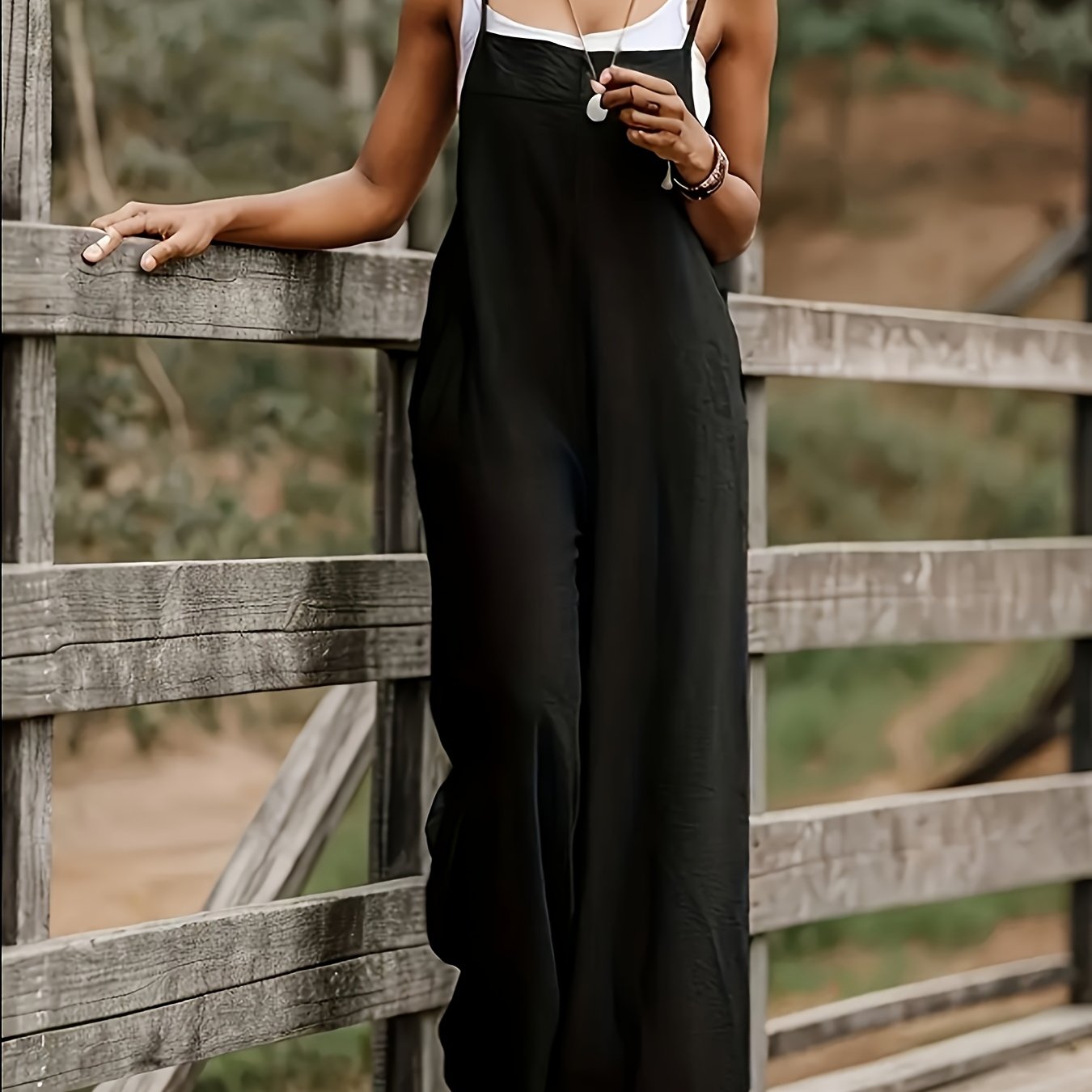 TEMU 여성용 블랙 와이드 레그 점프수트, 스파게티 스트랩 - 캐주얼 여름과 봄 패션, 성인, 휴가 스타일, 포켓, 캐주얼 의상 | 와이드 레그 점프수트 | 스파게티 스트랩 탑, 점프수트