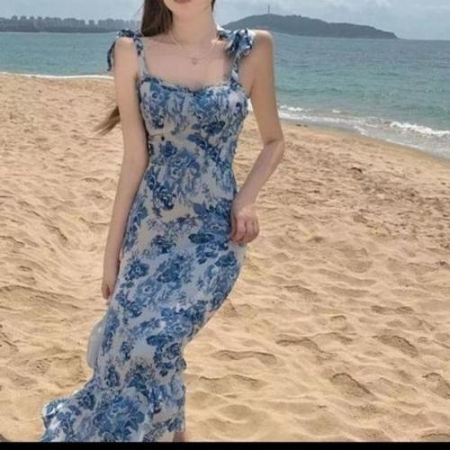 2024 유럽 및 미국 크로스보더 여성 신상 드레스 V넥 민소매 섹시 프린트 롱 밑단 해외 무역 드레스