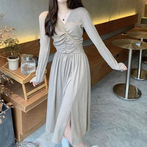 POMTOR 여성 라운드넥 슬림핏 스트링 긴팔 니트 원피스