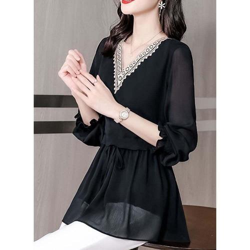 F7904/예쁨주의/허리셔링 펀칭레이스 V넥 블라우스/BL WFL8DCK
