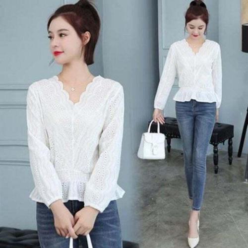 F55421 예쁨주의 허리셔링 펀칭레이스 V넥 블라우스 WFL8DD7