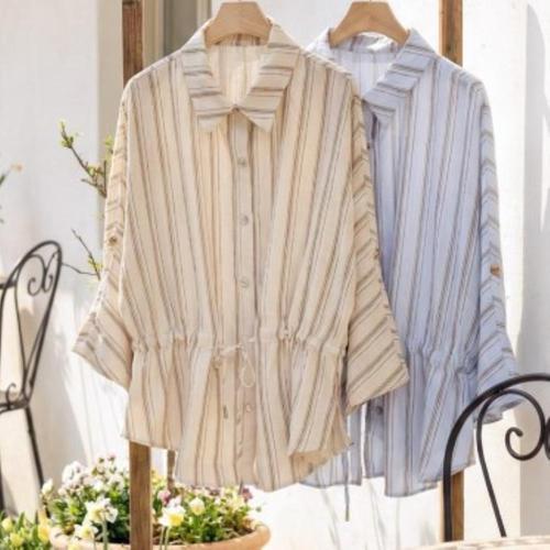 [옷자락] 여자 린넨 스트라이프 허리스트링 루즈핏 셔츠