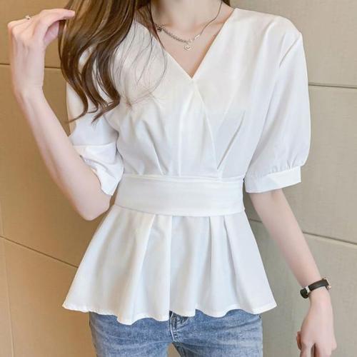 [오너클랜]인기상품 뒷단추 리본 화이트 블라우스 밑단 플레어 허리스트링 [WC3A1C1_250918]