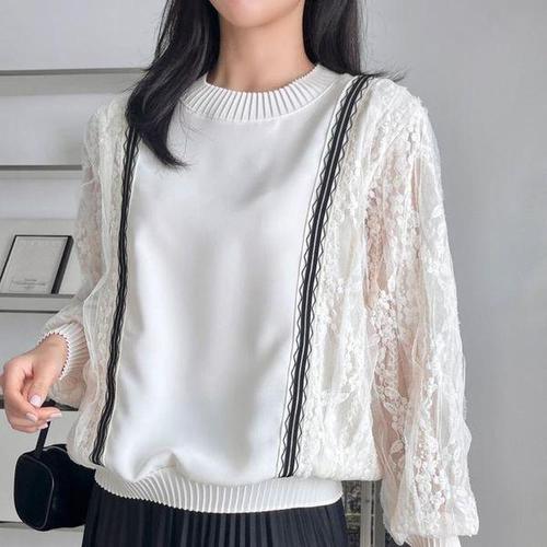 [셀러허브_여성트랜드패션]여자 벌룬 꽃무늬 플리츠넥 SS 레이스 블라우스