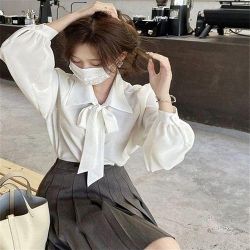 [신상오픈런]여성 리본 넥타이 큐빅 장식 퍼프 소매 빅사이즈 루즈핏 셔츠