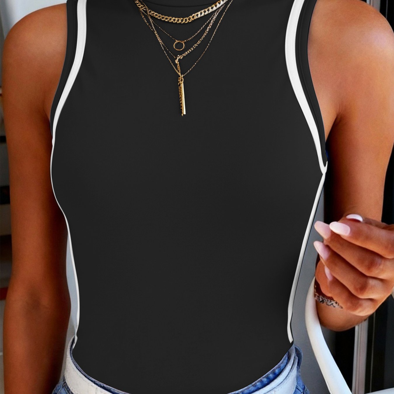 TEMU 여름용 하이넥 컬러블록 민소매 탱크탑 캐주얼 스트레치 티셔츠, 업무 및 여가용