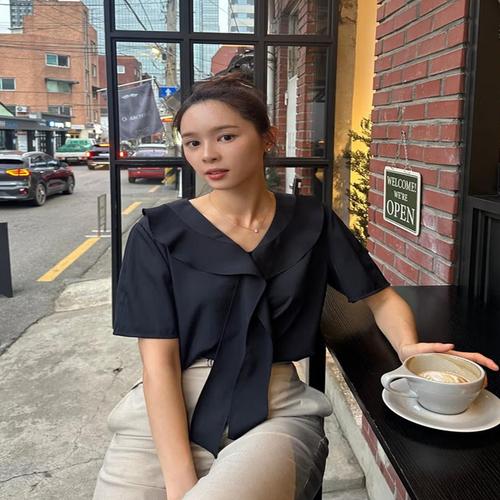 헤지스 여성 [CITY ESSENTIAL] 반팔 타이장식 블라우스 다크네이비 (HSSH5BP34N3)