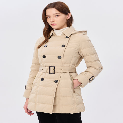 헤지스 여성 [클리어런스][스테디셀러][덕다운] 베이지 트렌치형 탈착 후드 하프 중량다운 점퍼 (WSJU4D028