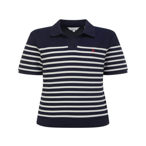 헤지스 여성 [아이코닉] 오픈카라 스트라이프 반팔 폴로 셔츠 네이비 (HSTS6BC43N2)