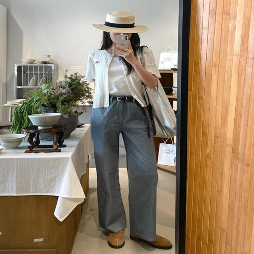 헤지스 여성 스트라이프 세미와이드 데님 팬츠 네이비 (HSPA5B383N1)