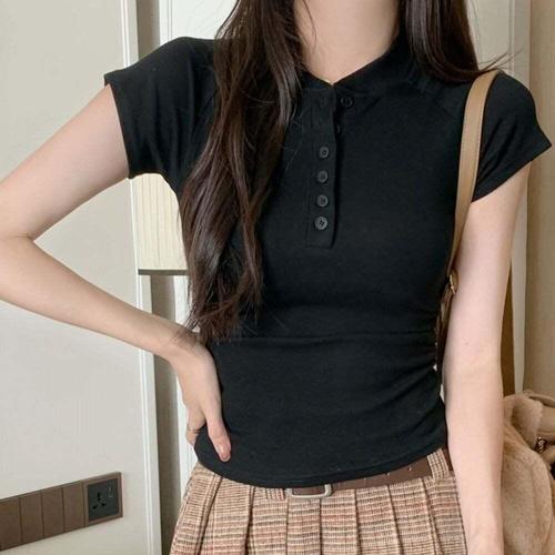 여성 헨리넥 U넥 버튼 반팔티 베이직 슬림 크롭 티셔츠 3색 WFKZVJD