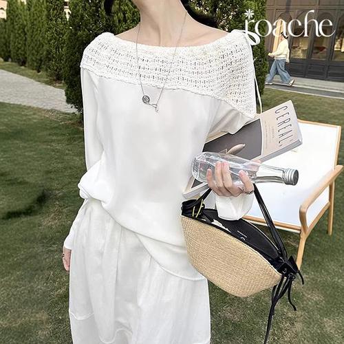 [헬렌]로아체 원오프숄더 봄 블라우스 여성 셔츠 긴팔 페미닌 여행룩 배색 레이스 루아베블라우스 CH-200