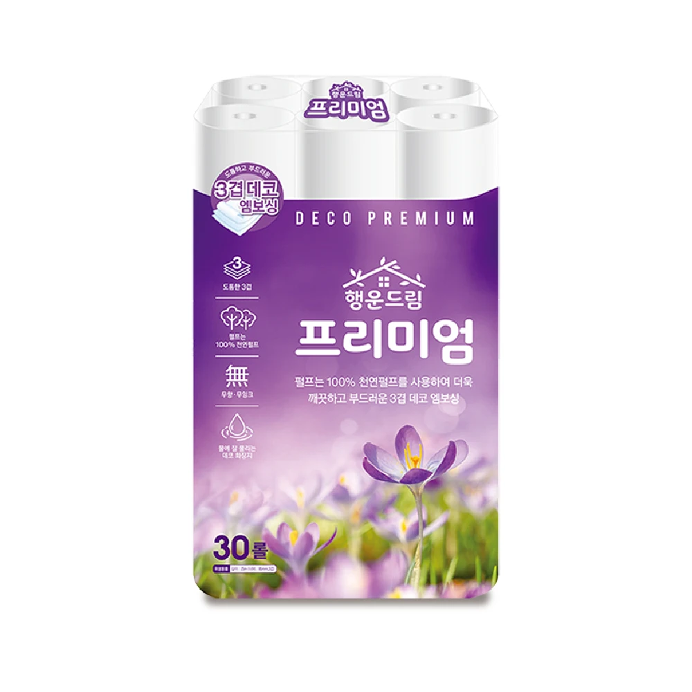 [국내제조] 행운드림 프리미엄 3겹 25m 30롤 천연펄프 화장지 휴지 비데겸용 두루마리