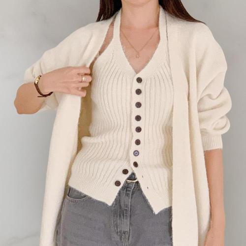 [옷자락] 여성 브이넥 홀터넥 버튼 골지 나시 루즈핏 가디건 세트