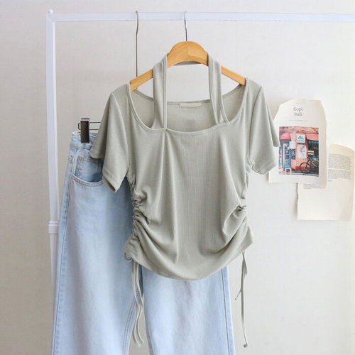 레이츄 / 홀터넥 쫀쫀 골지 스트링 빅사이즈 반팔 티셔츠