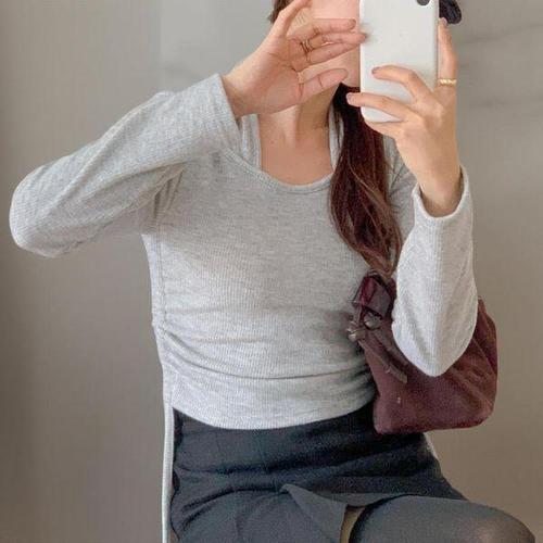 [옷자락]여자 홀터넥 라운드 옆셔링 크롭 골지 긴팔 티셔츠