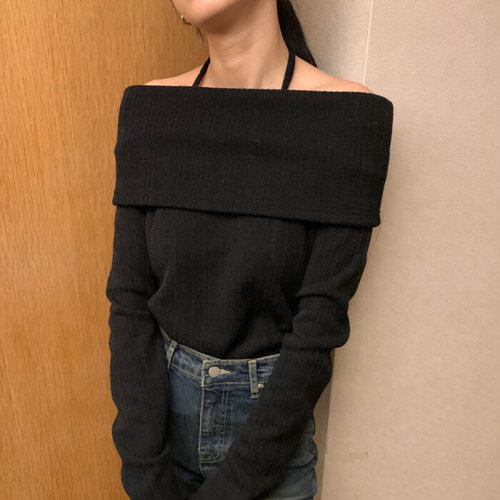 아이엠몽 여성 홀터넥 오프숄더 골지 니트 티셔츠