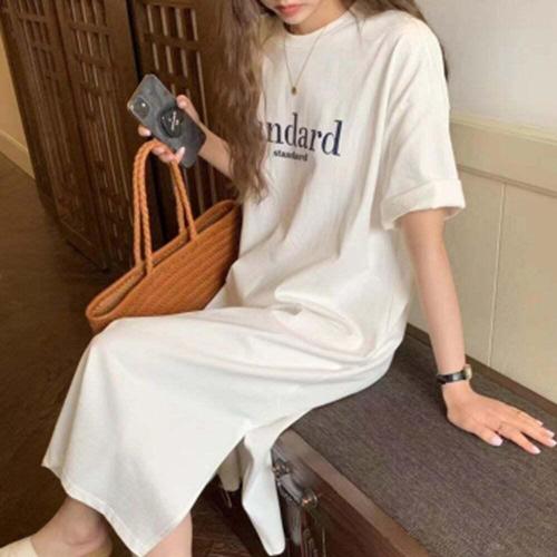 [셀럽하우스]레터링 HYRA1043 여성 캐주얼 반팔 트임 롱원피스 1P 나들이 홈