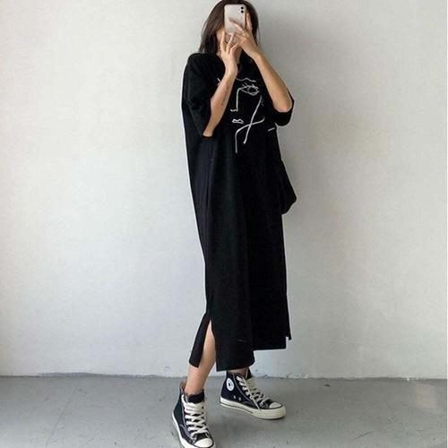 [셀럽하우스]롱원피스 UOBP6458 베이직 트임있는 홈웨어 레터링 올데이 간편