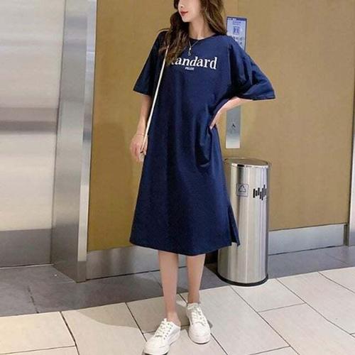 [셀럽하우스]레터링 NIYL4077 베이직 롱원피스 홈웨어룩 반팔원피스 올데이