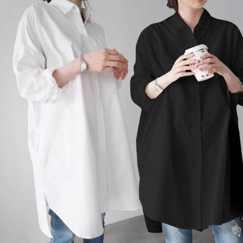 여성용 봄철 루즈핏 롱셔츠 오피스 블라우스 화이트 블랙 WFLN0RN