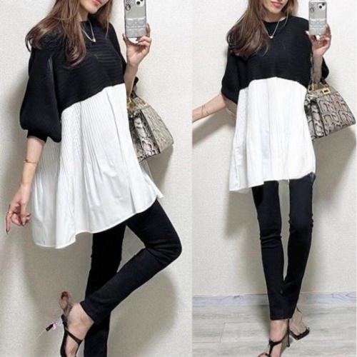 WL F671020 7부 소매 니트 화이트 주름 원피스 블라우스 WFLQROW