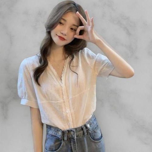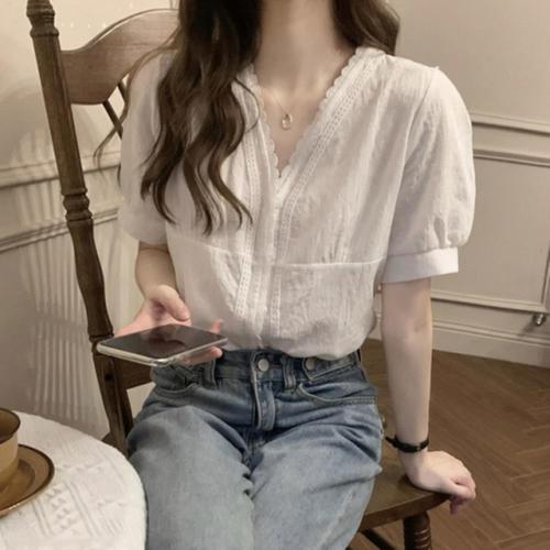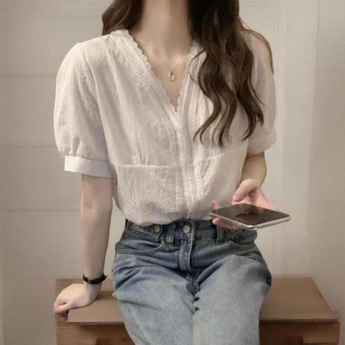 [신상오픈런]여자 화이트 레이스 자수 브이넥 반팔 블라우스