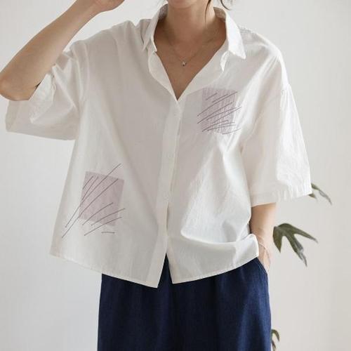 [샵앤]여성 카라넥 돗단배 자수 바스락 반팔 셔츠 블라우스 BONG-WBL-4502-화이트