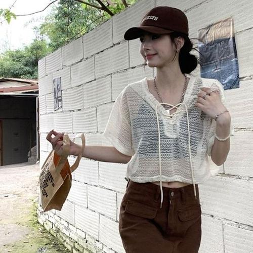 [엄지척]후드 크롭 여성 여름 반팔 니트 티셔츠 데일리 캐주얼_19680881_667501