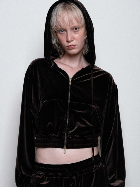 [더포르타] HOTFIX LOGO VELVET HOODIE ZIP-UP, BROWN