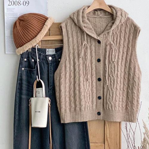 [옷자락]여성 캐주얼 꽈배기 후드 니트 베스트 스트링 단추 포함