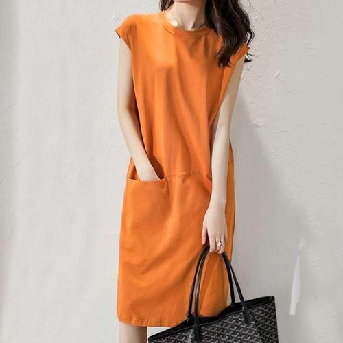 [셀럽하우스]여름 AUKD6827 휴가 여성 라운드넥 포켓 미디 원피스